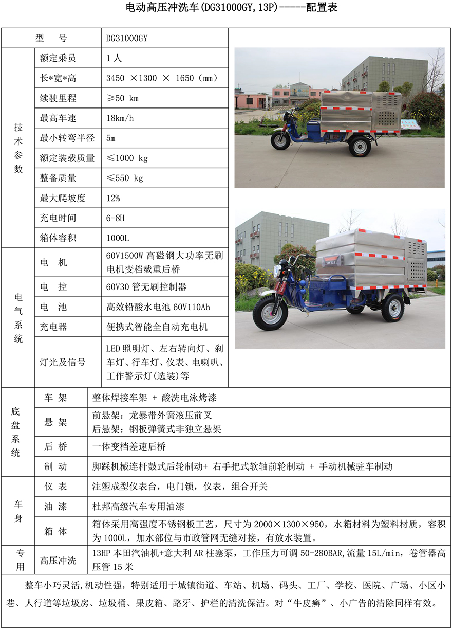 产品型号:DG31000GY1000l不锈钢高压清洗车